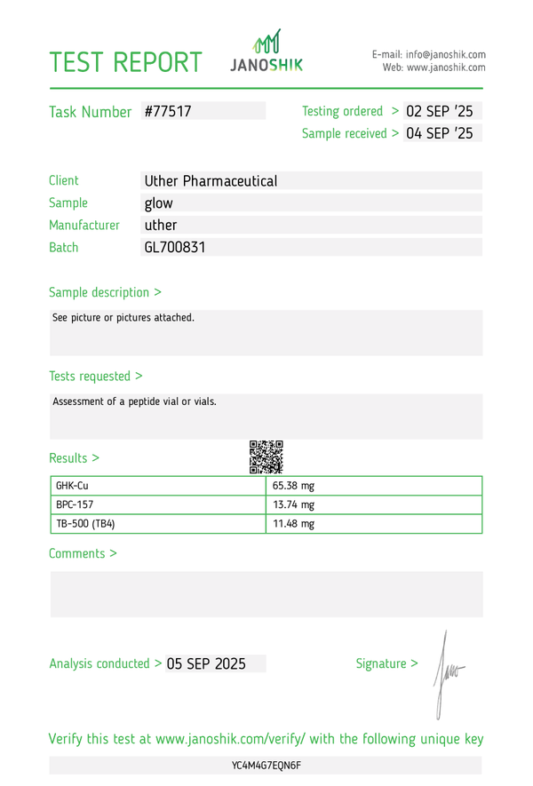 The GLOW stack combines three bioactive peptides—BPC-157, TB-500 (a synthetic fragment of thymosin beta-4), and GHK-Cu (glycyl-L-histidyl-L-lysine copper complex)—that have been studied for their roles in tissue repair, cellular signaling, and extracellular matrix remodeling. BPC-157 is a stable gastric pentadecapeptide investigated for its cytoprotective effects and its ability to modulate angiogenesis, nitric oxide signaling, and fibroblast activity. TB-500 is studied for its influence on actin regulation, cell migration, and inflammatory pathways, with downstream effects on tissue regeneration and wound healing processes. GHK-Cu is a naturally occurring copper-binding tripeptide involved in gene expression modulation related to collagen synthesis, antioxidant defense, and skin and connective tissue remodeling. Collectively, this peptide combination has been explored in preclinical and experimental contexts for its effects on regenerative signaling pathways, vascular integrity, and structural protein turnover.